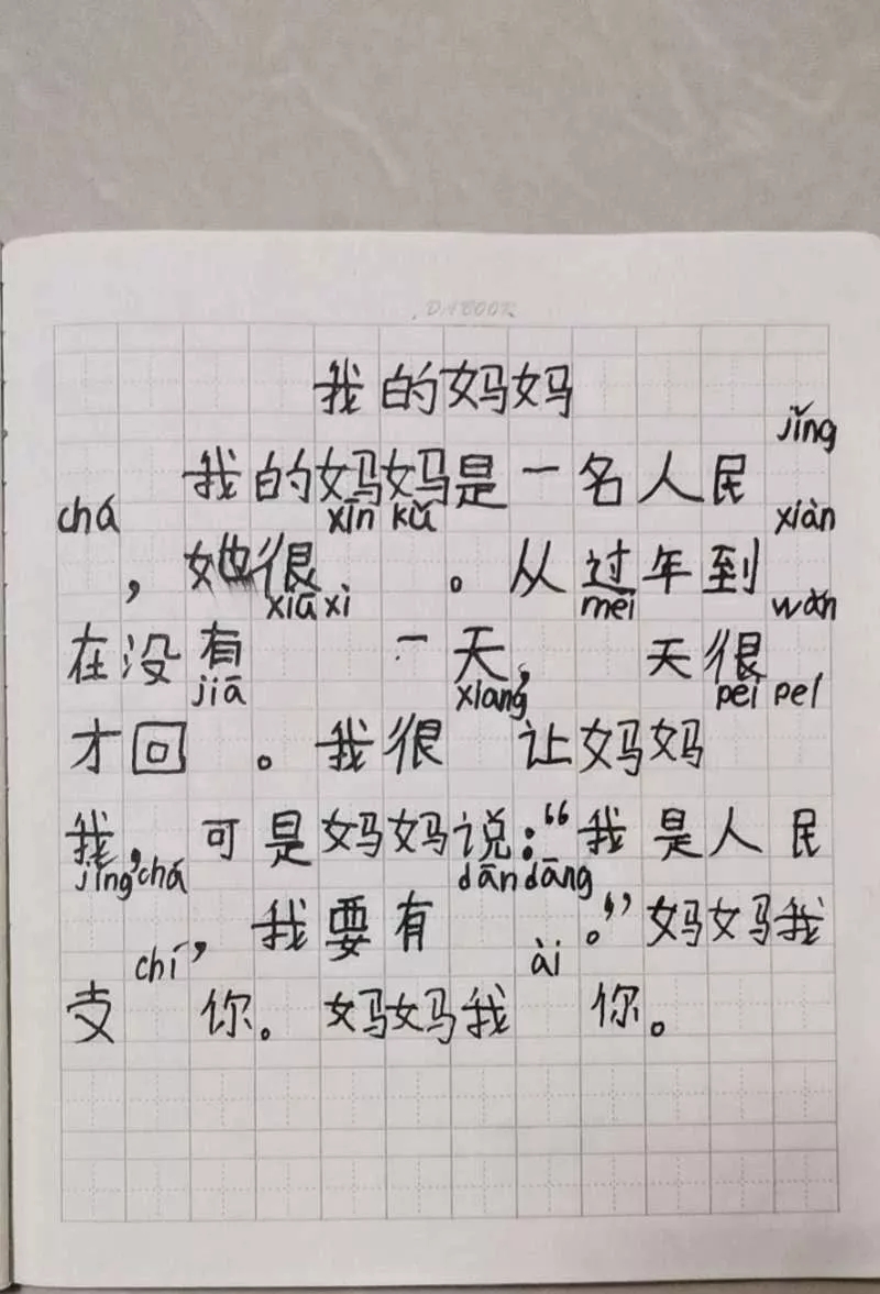 我的妈妈是一名人民警察,她很辛苦,从过年到现在,她没有休息过一天,我想让妈妈陪陪我,可是妈妈说她是警察,她要有担当,我爱你!