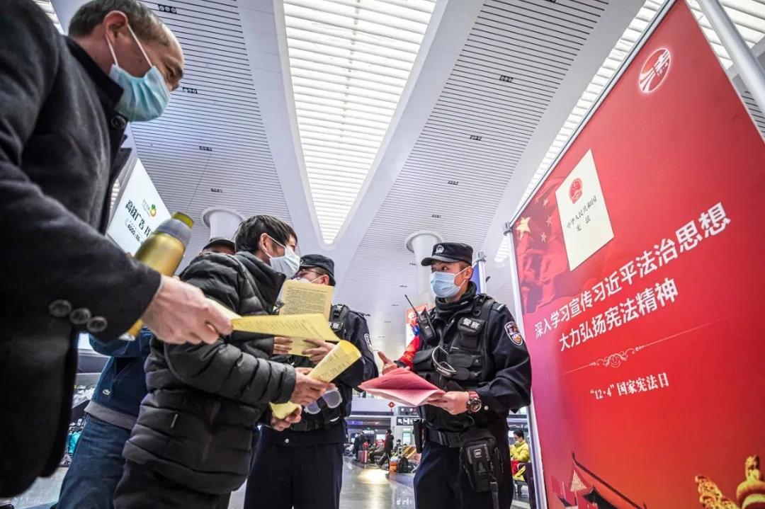 乌鲁木齐铁路公安局乌鲁木齐公安处乌鲁木齐站派出所组织民警深入候车旅客中间,广泛开展法治宣传活动。民警在向旅客发放宣传单的同时,详细向旅客群众解读了宪法对公民权利的保障,以及设立“国家宪法日”的重大意义。(李国贤)