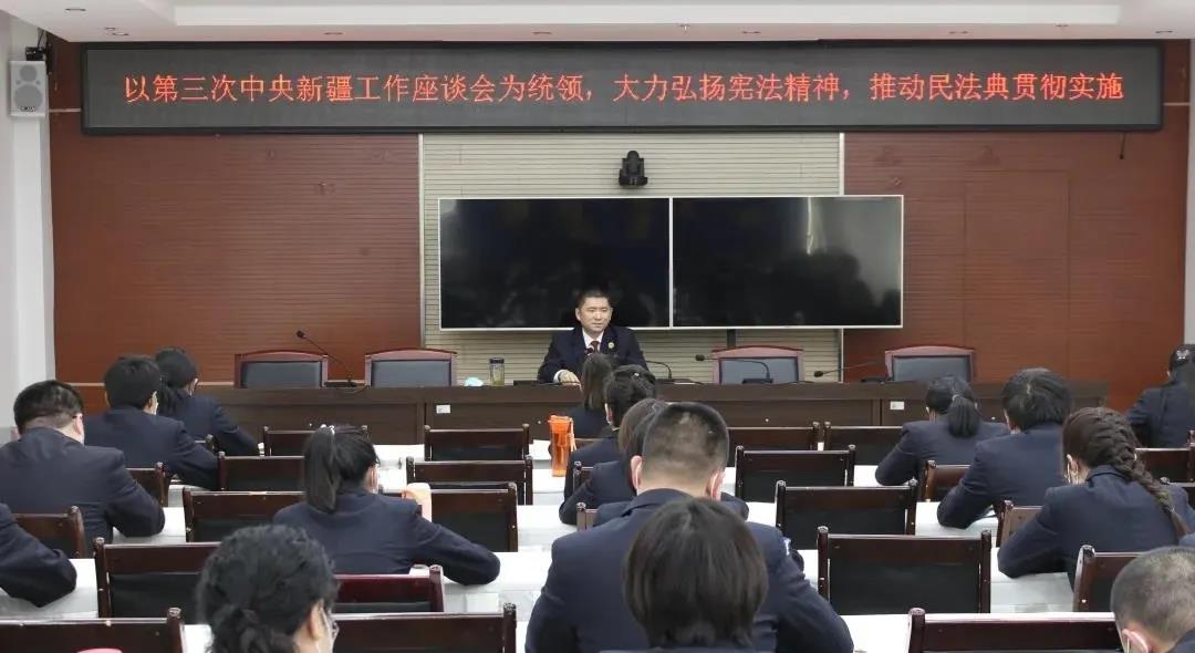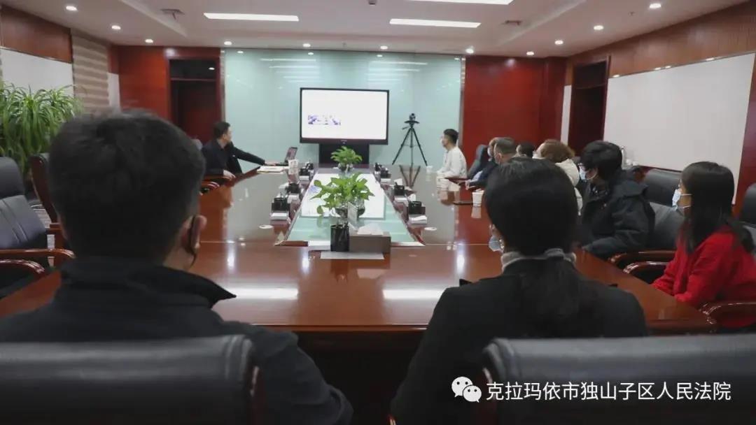 克拉玛依市独山子区人民法院法官为新疆世业建筑安装工程有限公司与新疆国鼎盛建筑安装工程有限公司负责人及员工作法治专题宣讲。大家一起学习了习近平依法治国的重要讲话精神、党的十九届五中全会精神及第三次中央新疆工作座谈会精神。在互动交流中,法官对企业人员提出的相关法律问题进行了解答。(克拉玛依市独山子区人民法院)