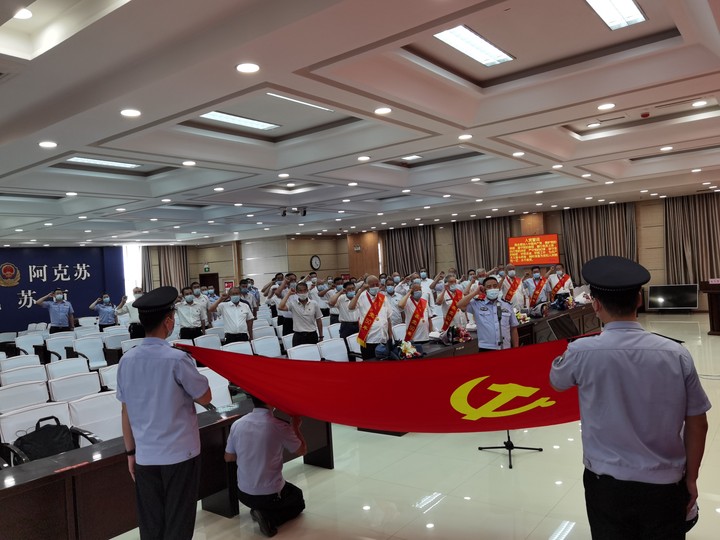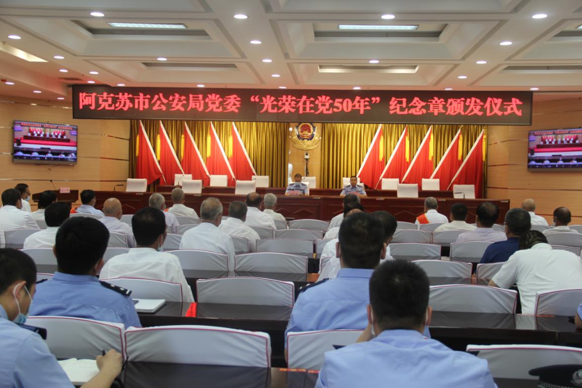 6月17日,在全国喜迎建党100周年和全党深入开展党史学习教育之际,阿克苏地区阿克苏市公安局举办“光荣在党50年”纪念章颁发仪式。