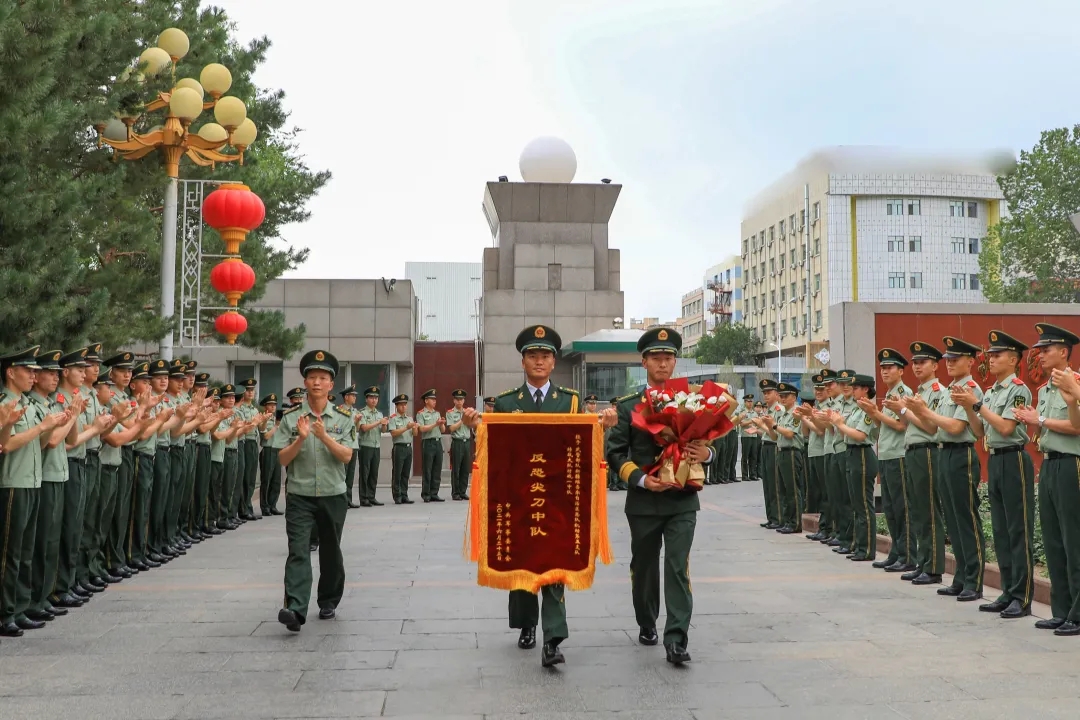 7月7日下午,武警新疆总队机关院内锣鼓喧天、掌声雷动,总队党委常委、部门领导、全体机关干部和直属队官兵,列队欢迎被中央军委授予“反恐尖刀中队”荣誉称号的总队某机动支队特战大队特战一中队官兵代表载誉归来。