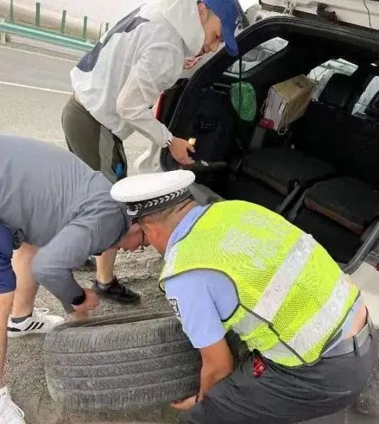 8月1日,游客安女士一行8人驾车从喀什前往库尔勒途中,行驶至轮台县境内时,其中一辆车发生爆胎,而车内的乘客和司机均不会换胎。恰巧两位巡逻民警驾车经过,立即拿出工具帮忙换好轮胎,并护送安女士一行到达库尔楚收费站与接应他们的车辆会合。