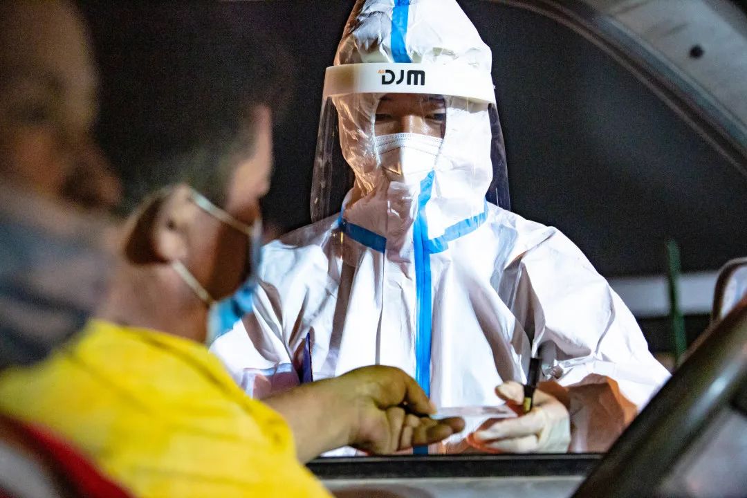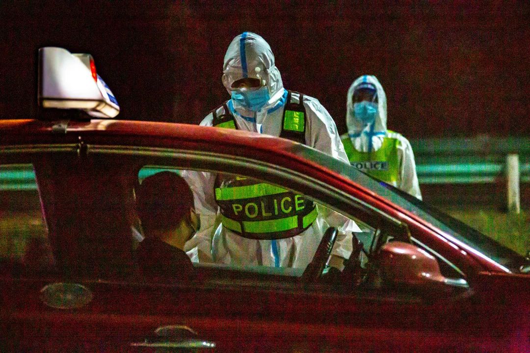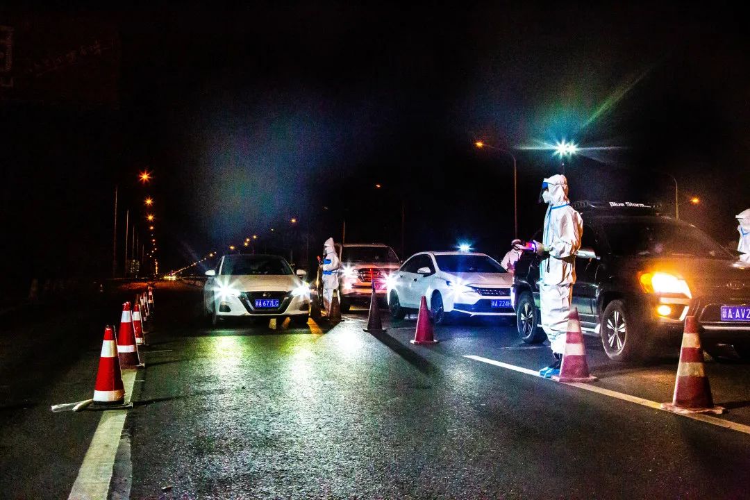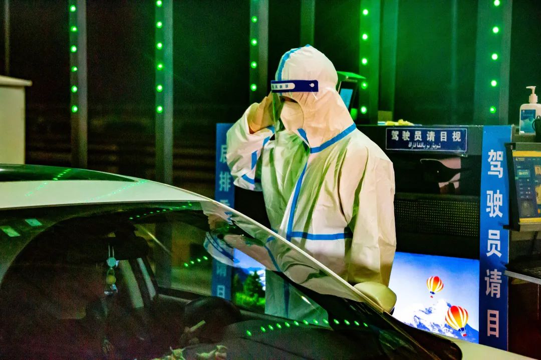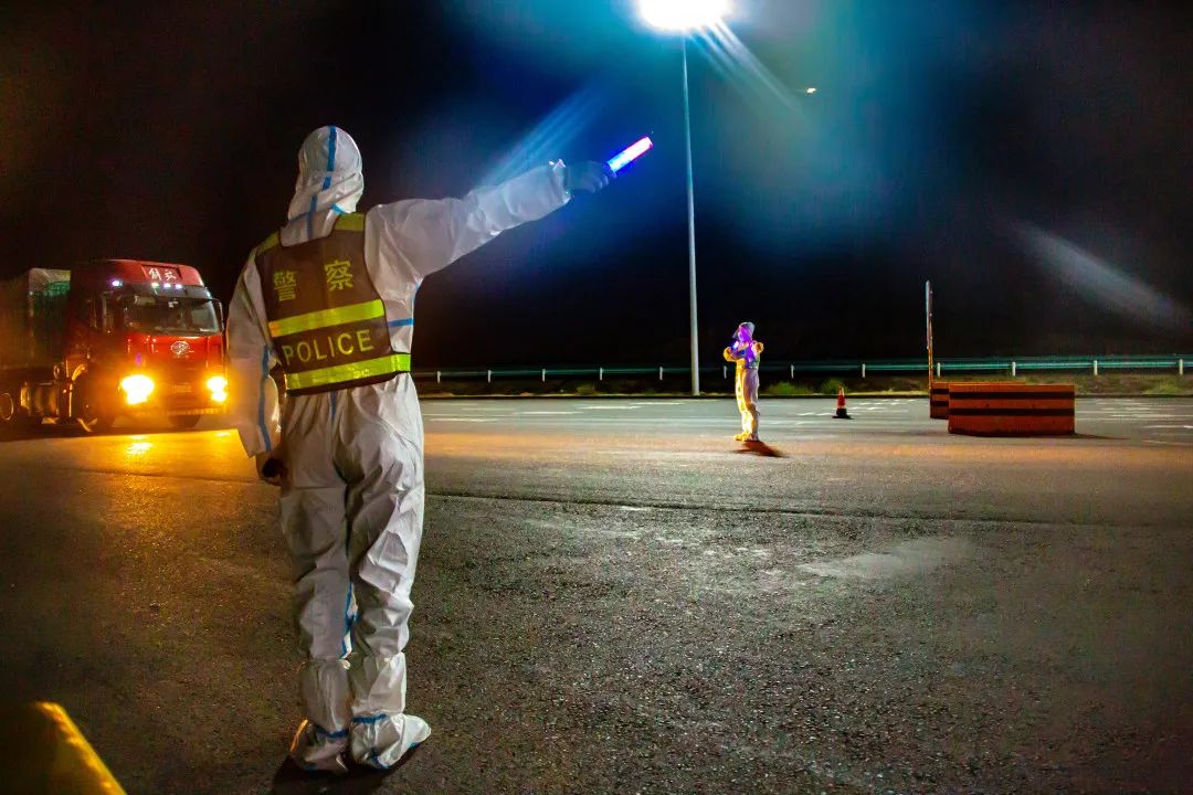 深夜里,乌鲁木齐市甘泉堡公安检查站前150米处有一群“大白”格外醒目——他们手握警灯细致耐心地引导大型货车通行;对小型客车询问来去方向,不忘叮嘱:“请佩戴好口罩,做好自身防护”。