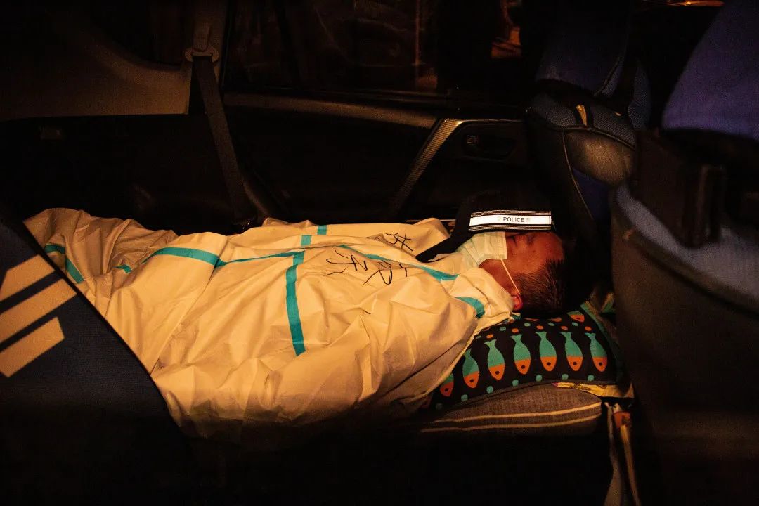 ▲此时已是凌晨3点,刚被同事换下岗的民警,在车里搭了简易床铺合衣而睡。休息后,他还要继续第二天的防控工作。