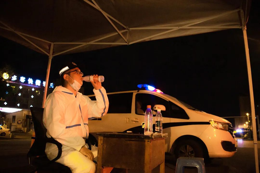 ▲夜深了,在水区南湖二期,民警摩挲着脑门保持清醒。守好不远处的小区大门就是他今晚的工作。