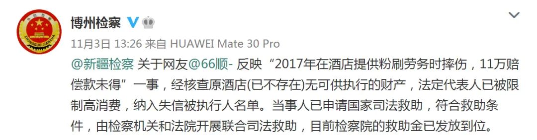 11月3日13时26分,“@博州检察”再次发微博称,涉事酒店无可执行财产,法人已被限高消费、纳入失信被执行人名单。当事人符合司法救助条件,提出申请后,检察院和法院已联合开展司法救助,目前,检察院的救助金已发到位。