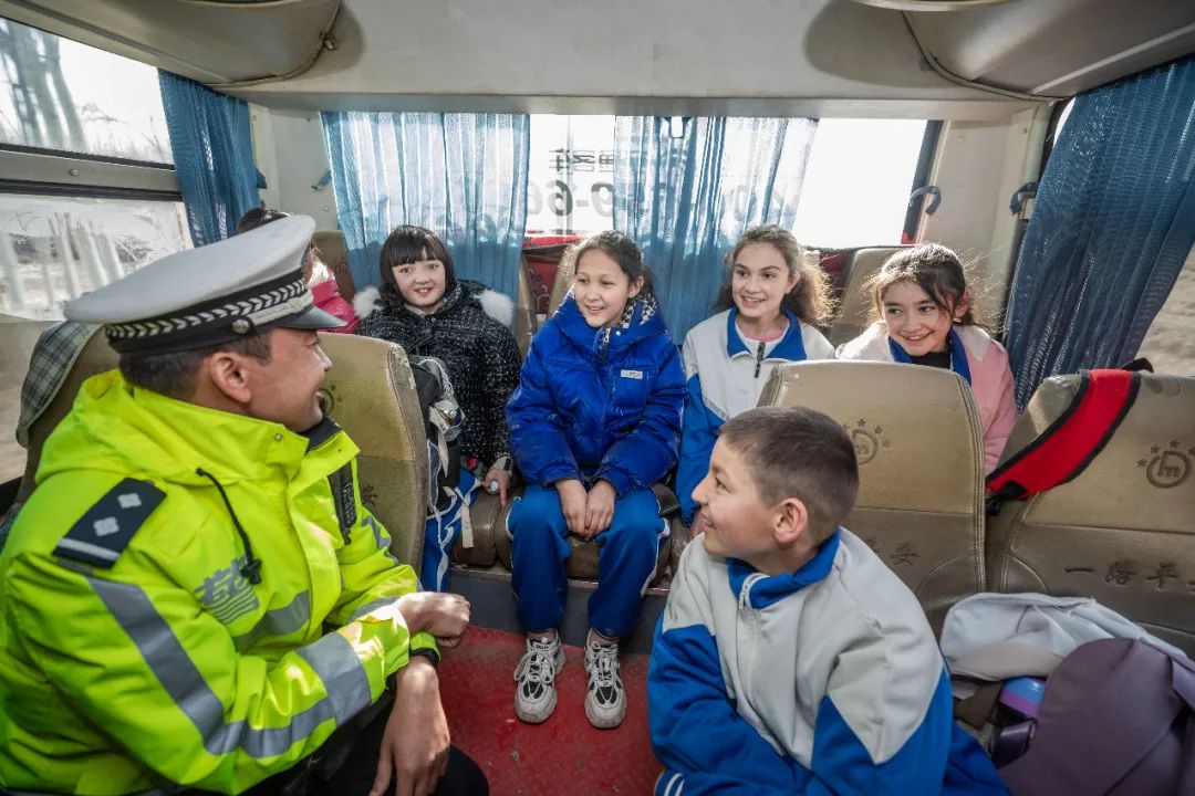 途中,大巴车上,一堂特殊的“开学法治第一课”开始了。民警亚森江·买买提给孩子们讲解出行注意事项,提醒大家要遵守交通法规,确保安全出行。