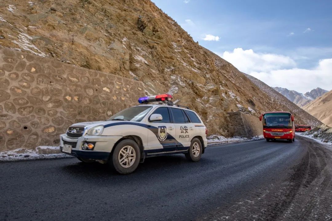 2月16日清晨8时,何海东和战友亚森江·买买提,带领“护学队”开始由叶城县城向西合休乡进发。在蜿蜒陡峭的公路上,车队一路谨慎驾驶,路旁就是悬崖绝壁。“护学队”采取由一辆警车带道,另一辆警车收尾的方式护送, 遇到急弯鸣笛示意对向来车, 以确保整个车队的安全。从2553公里行驶至2680公里处,这127公里的路程,海拔却由1300米徒升3500多米, 每到一处结冰路段,“护学队”在何海东的指挥下,低档低速前行。