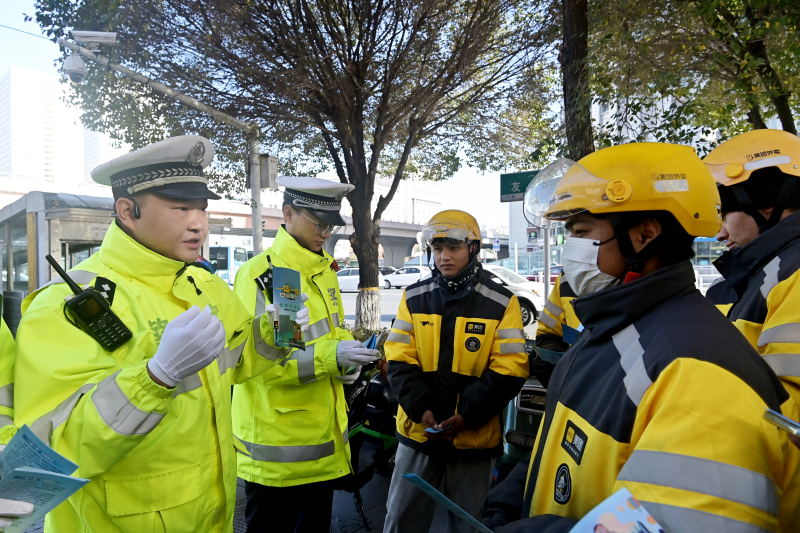 10月25日,乌鲁木齐市沙依巴克区友好南路街道友好社区联合乌鲁木齐市公安局交警支队沙依巴克区大队友好路中队为摩托车驾驶人、外卖小哥开安全宣传活动。石榴云/新疆法治报记者 单坤摄