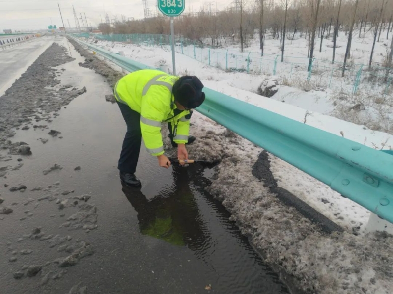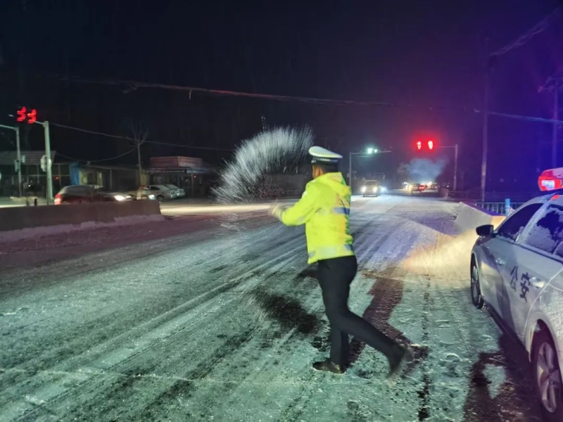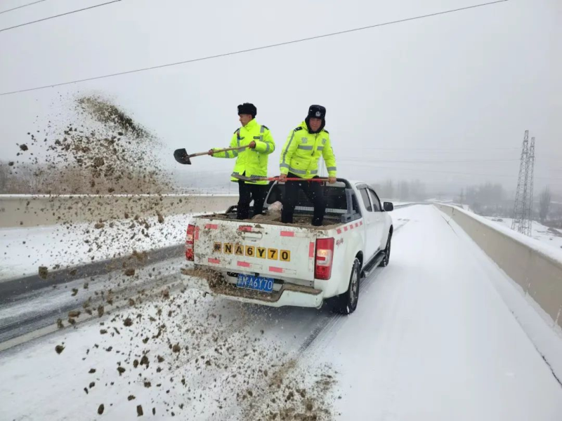 伊犁交警全员上岗,坚守一线,全面开展道路疏导与交通保障工作。在市区主干道和高速公路上,执勤交警提前上岗指挥、疏导交通;联合相关部门清除积雪,防止路面结冰,确保车辆通行安全;在积雪较厚的地方,与路政部门协调,使用除雪机械和盐撒布车清理积雪;在山区,道路弯道及坡道等易结冰的地段,与交通部门密切配合,设置警示标志,提醒过往司机减速慢行,并指引车辆绕行或临时停运,确保行车安全。