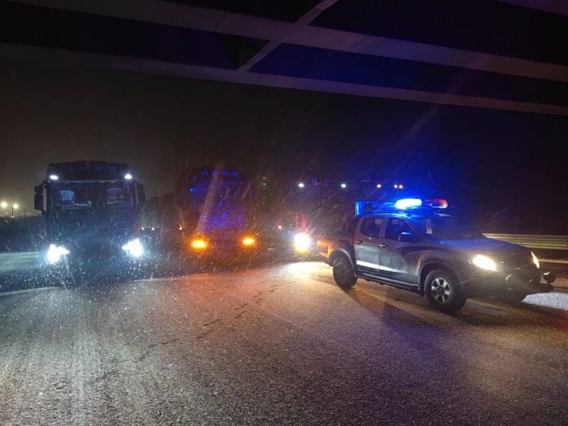 新疆公安厅交警总队高等级公路支队启动预案,将警力投入路面一线,警企联防、高地联动,加强巡逻、疏导、管控力度,积极帮扶救助群众。密切配合养护部门及时开展清雪除冰作业,重点路段以警车压速带道方式护送车辆有序通行。目前,除雪作业、警车压速带道等保通保畅工作正在进行中。