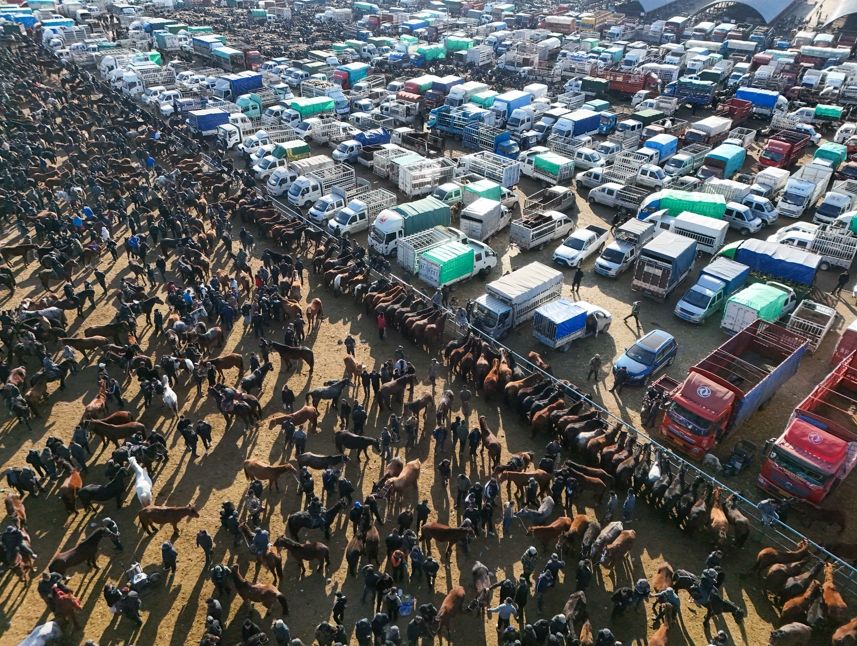 新疆创锦黄公农产品交易市场的马匹交易区 胡虎虎 摄