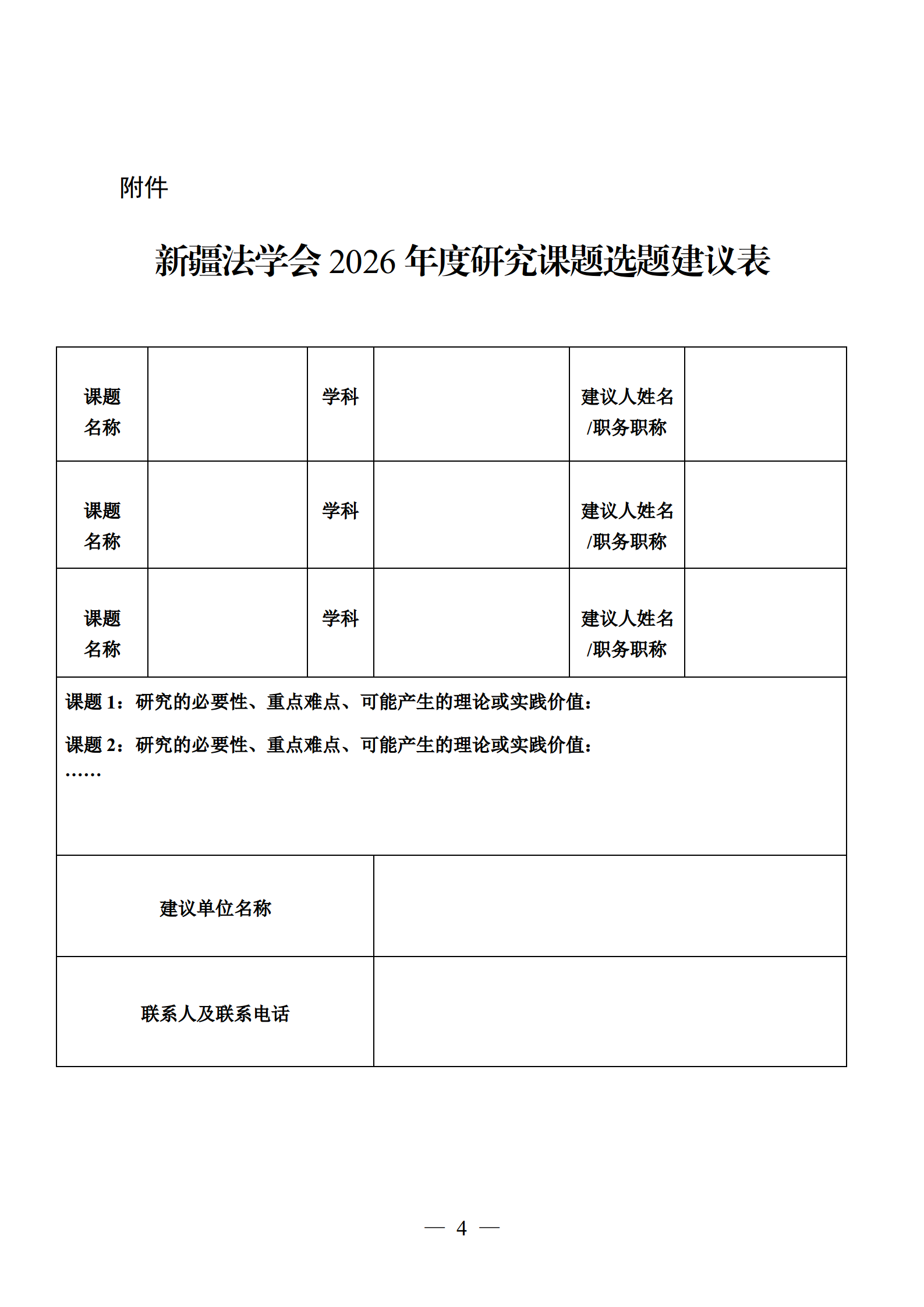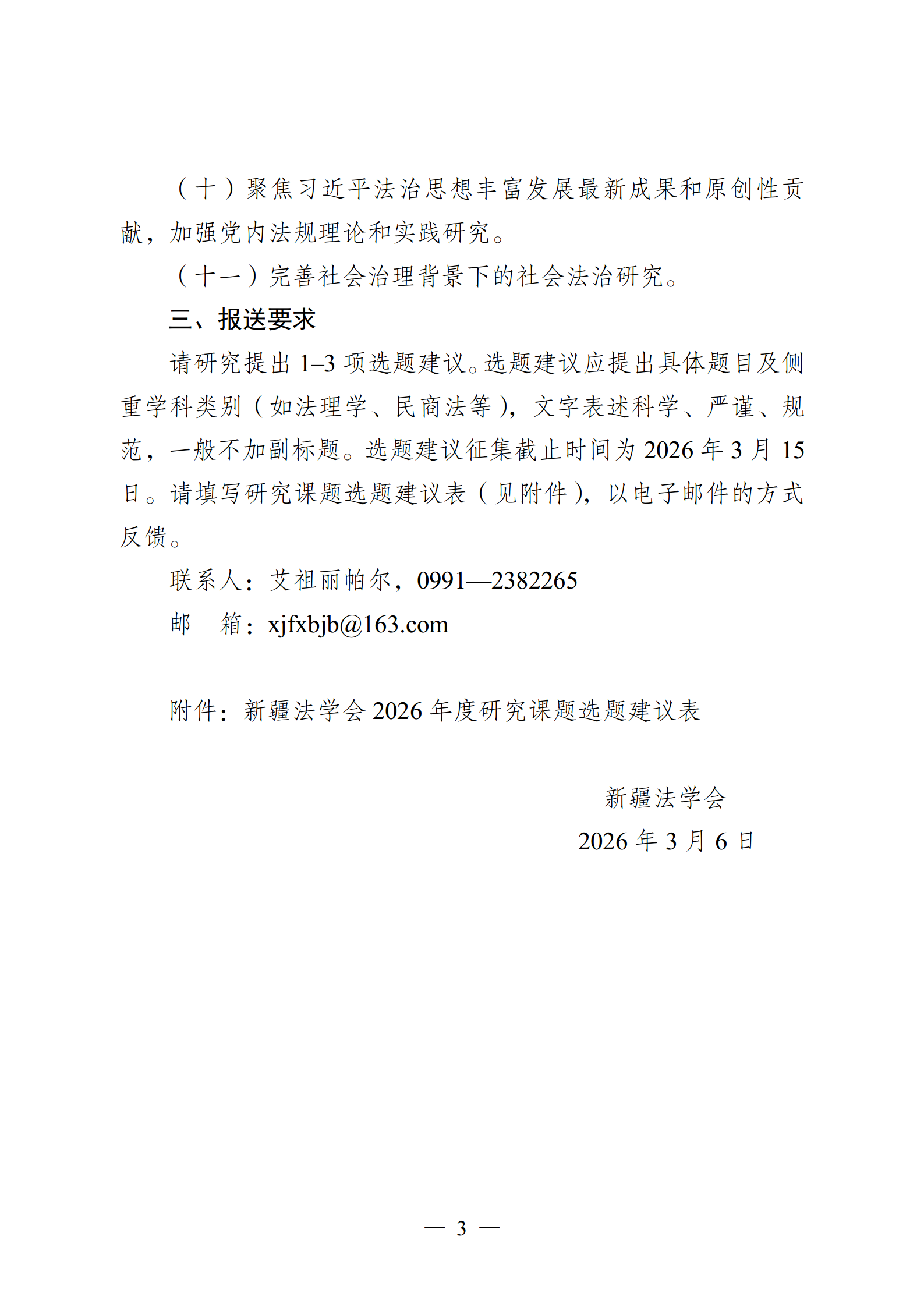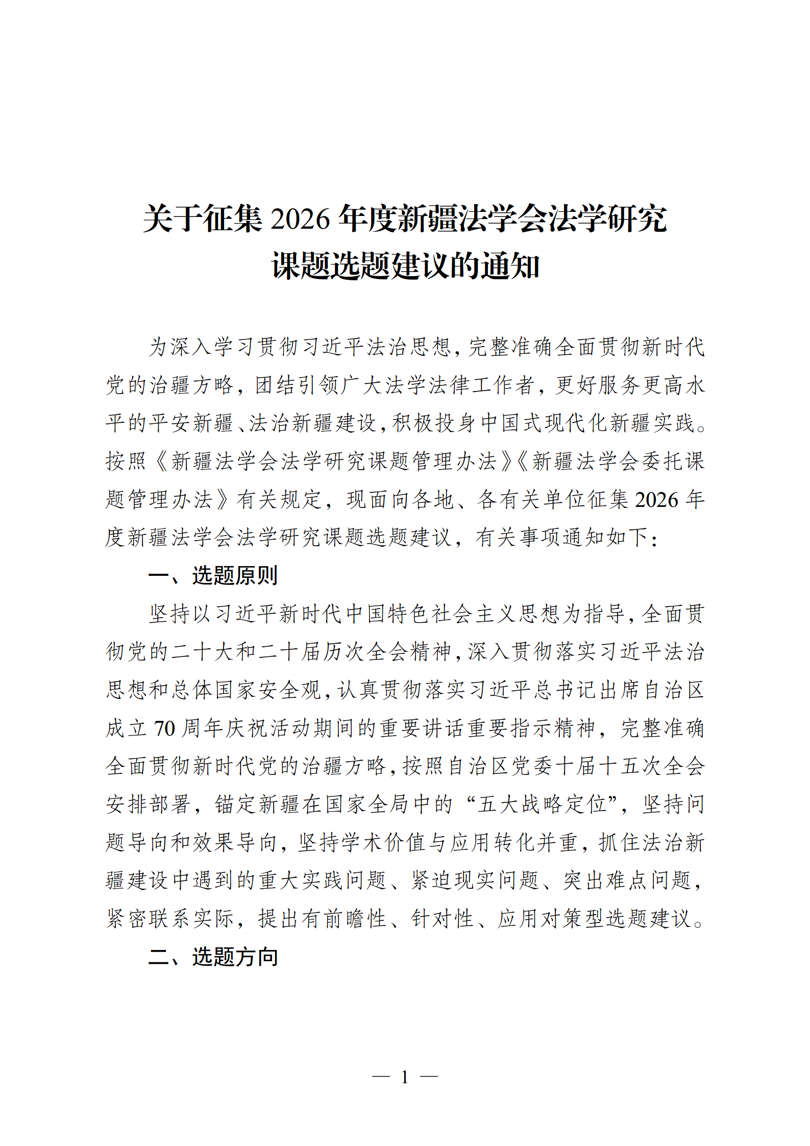 关于征集2026年度新疆法学会法学研究课题选题建议的通知